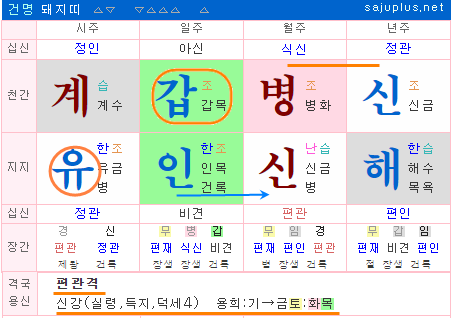 위 명조는 신월에 태어난 갑목일간의 편관격 남명사주입니다. 연간에 정관 신금, 월지에 편관신금, 시지에 정관 유금이 위치해 관살이 3개나 되는 외관상으로는 관살혼잡의 명입니다.